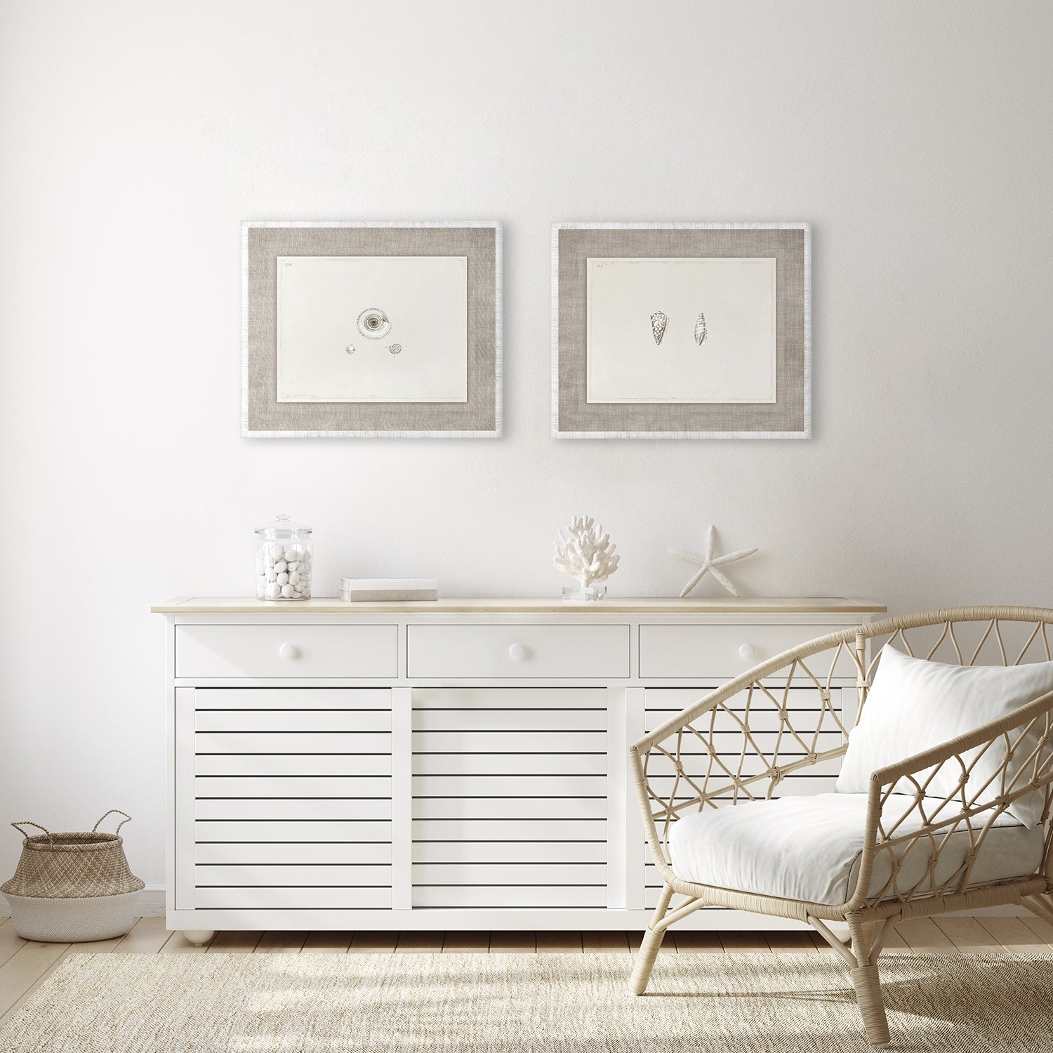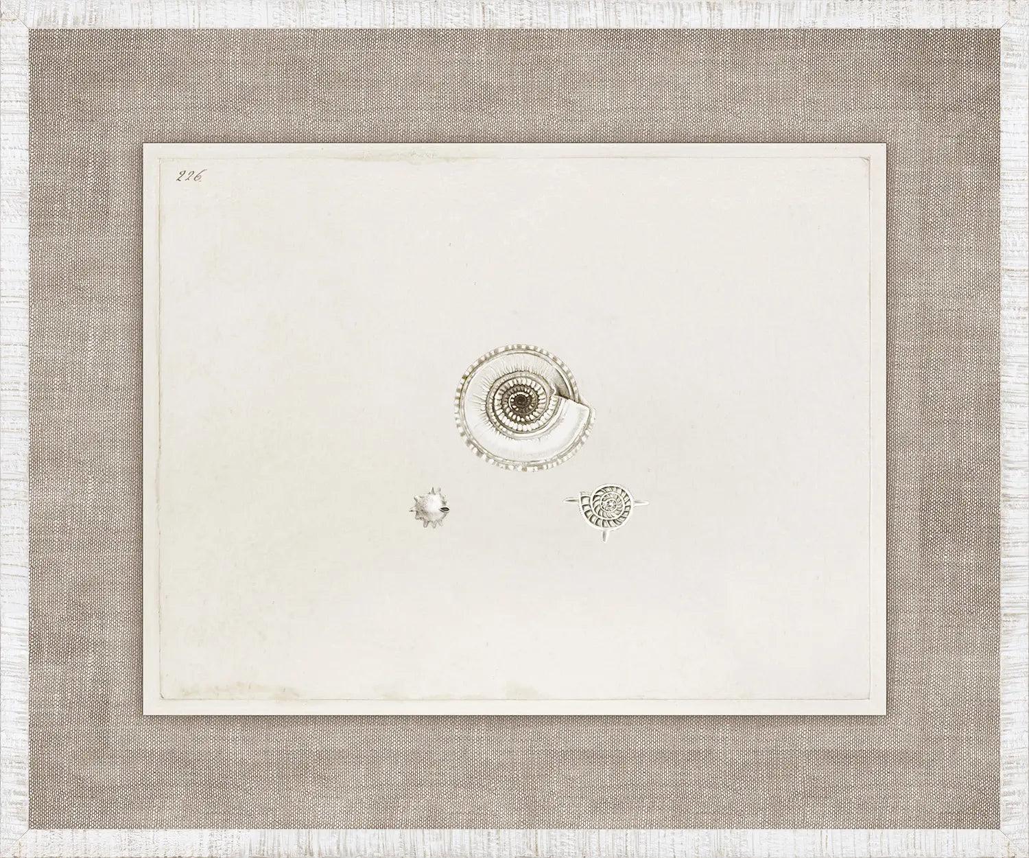 Precious naturalist illustrations of various seashells presented in a historical style with aged paper and hand written numbers. In a rustic white wood frame with a rippled texture.