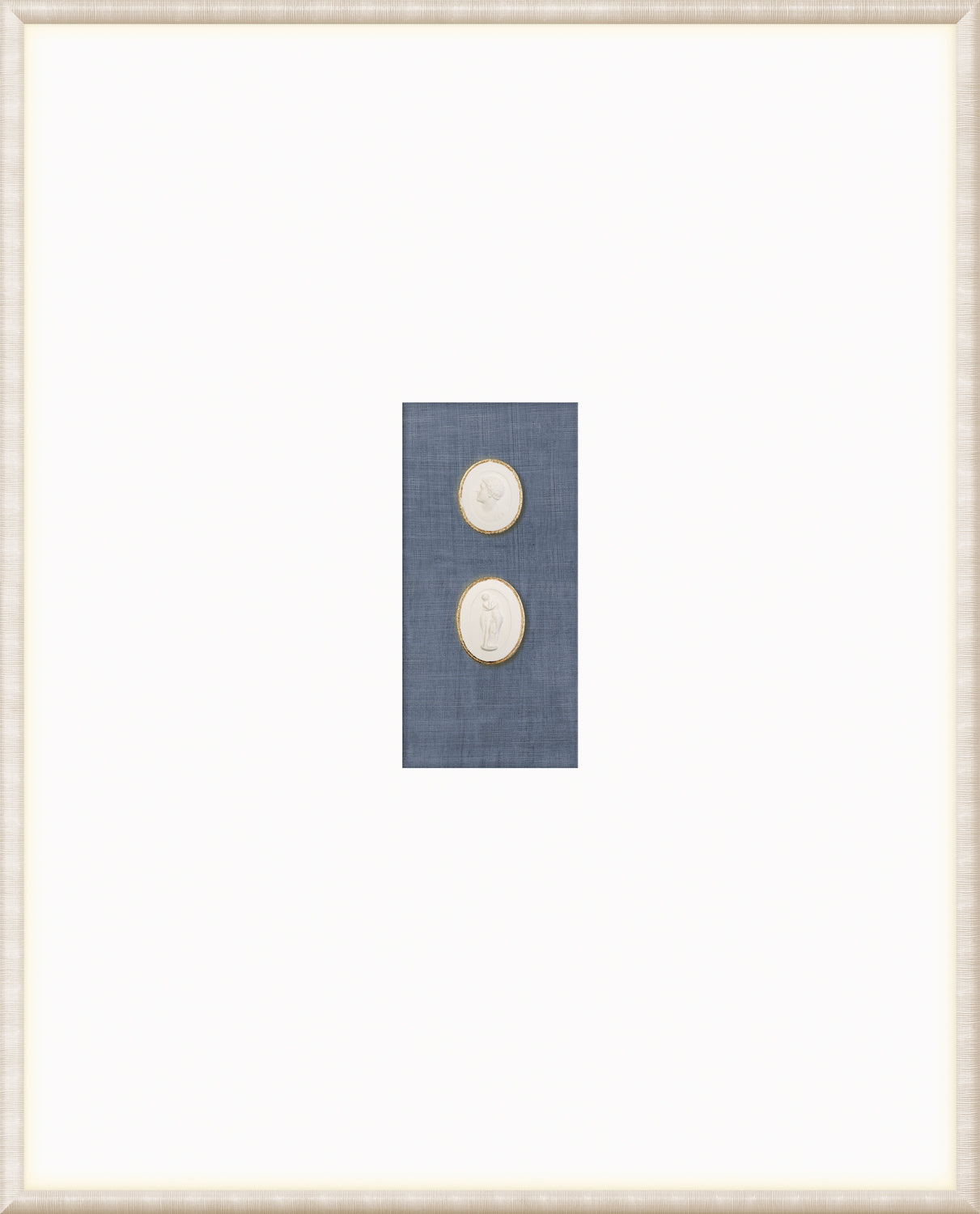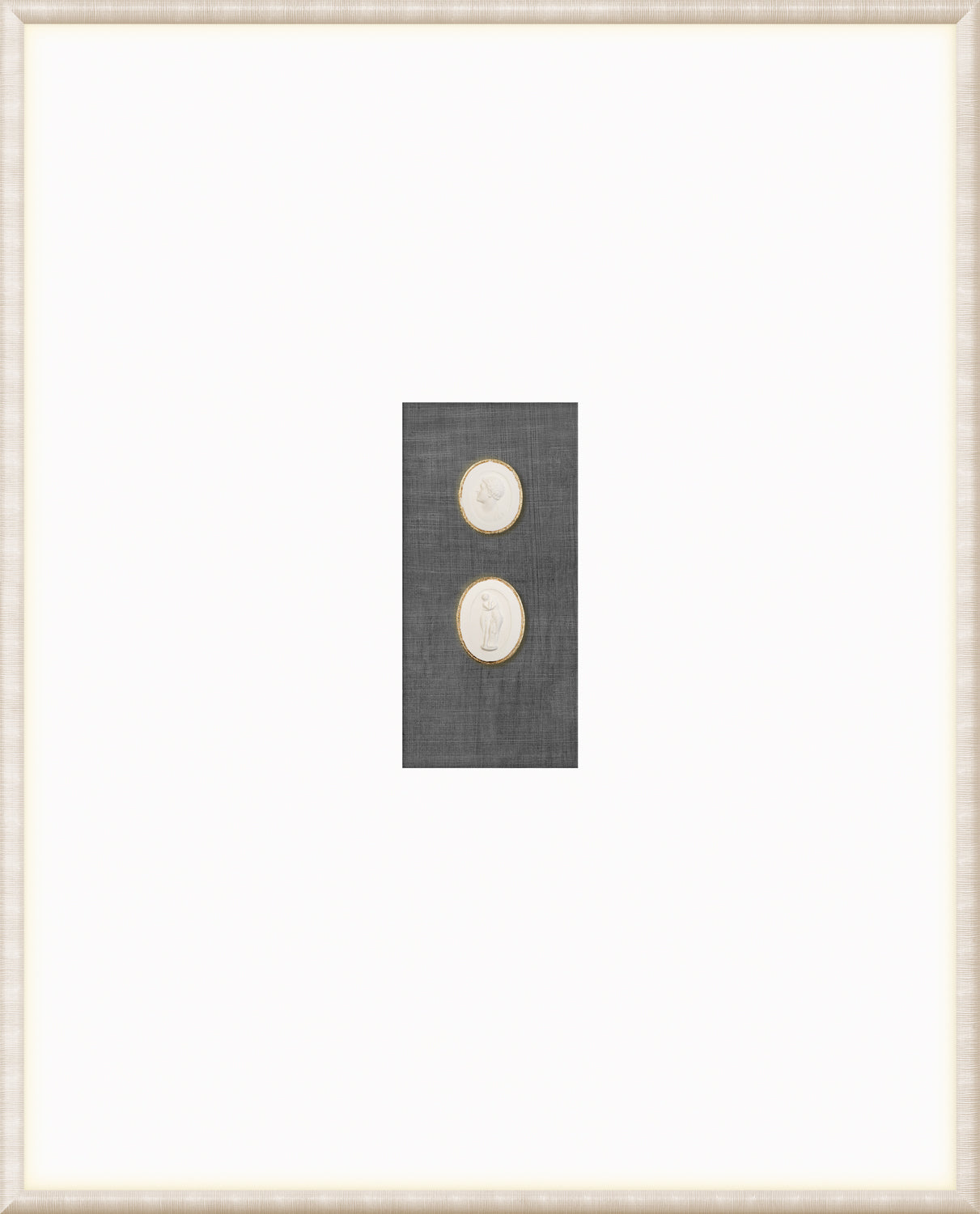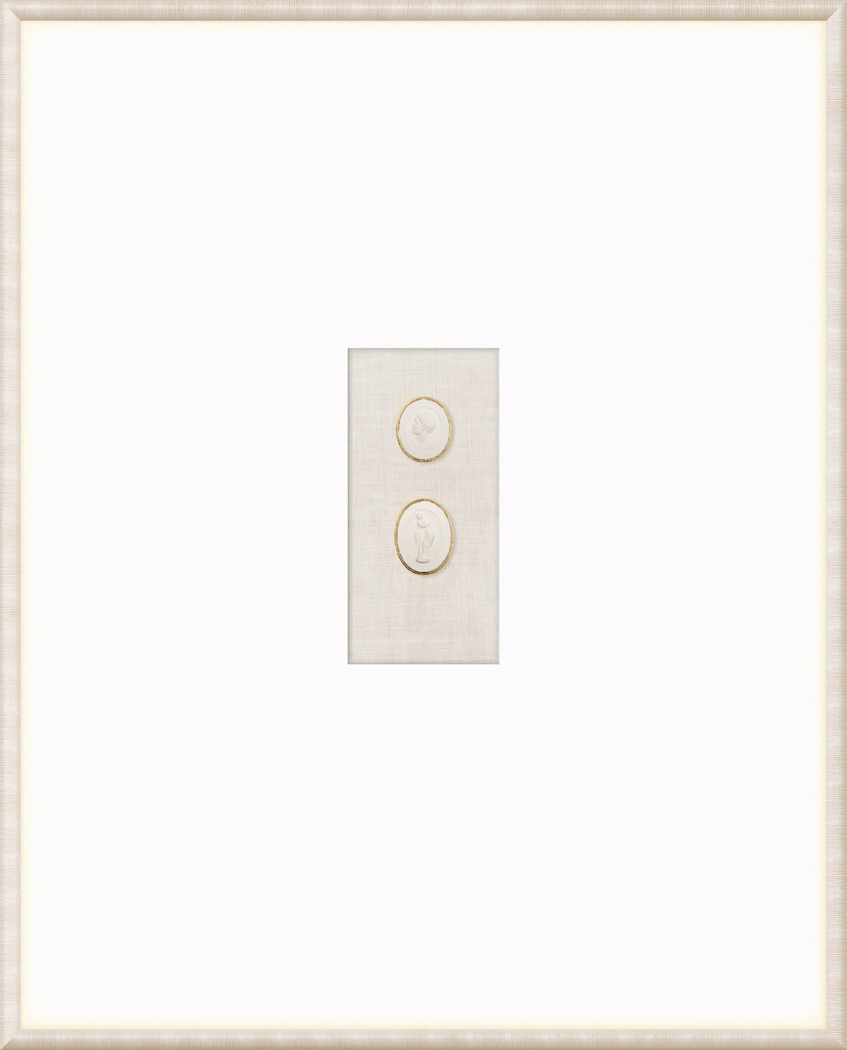 Our collection of Intaglios features both mythological and historical figures. Each one is hand-cast and gilded with fine gold filigree along the upper edge, framing the carved images and making them truly unique pieces. Each grouping is mounted on a linen texture background in a variety of colour options. They are framed in a light, neutral-toned moulding with a striated texture and a wide, raised matte with gilded framespace, giving them even more elegance and luxury. With our wide variety of arrangements and different combinations of Intaglios, you’re sure to find the perfect groupings for you.