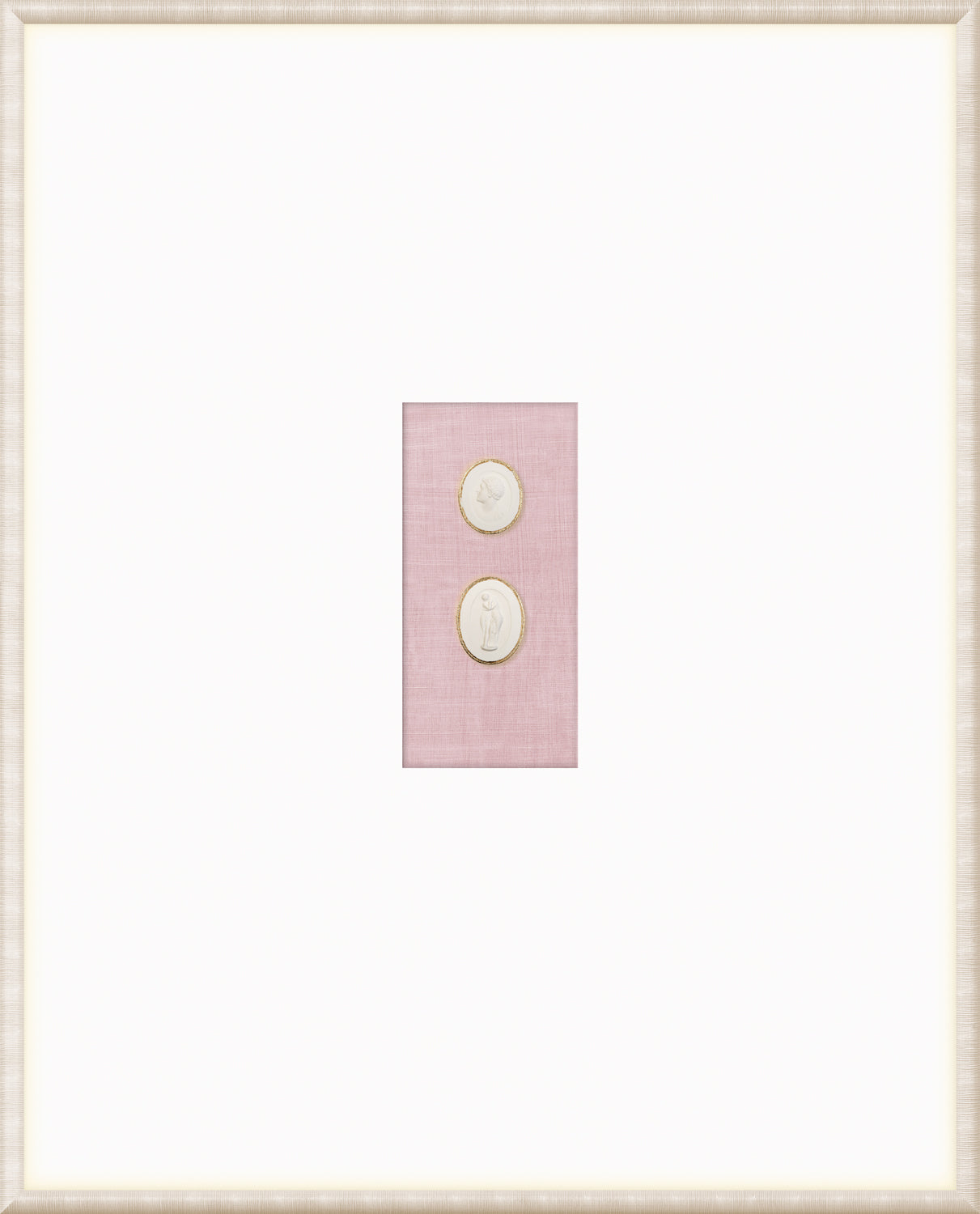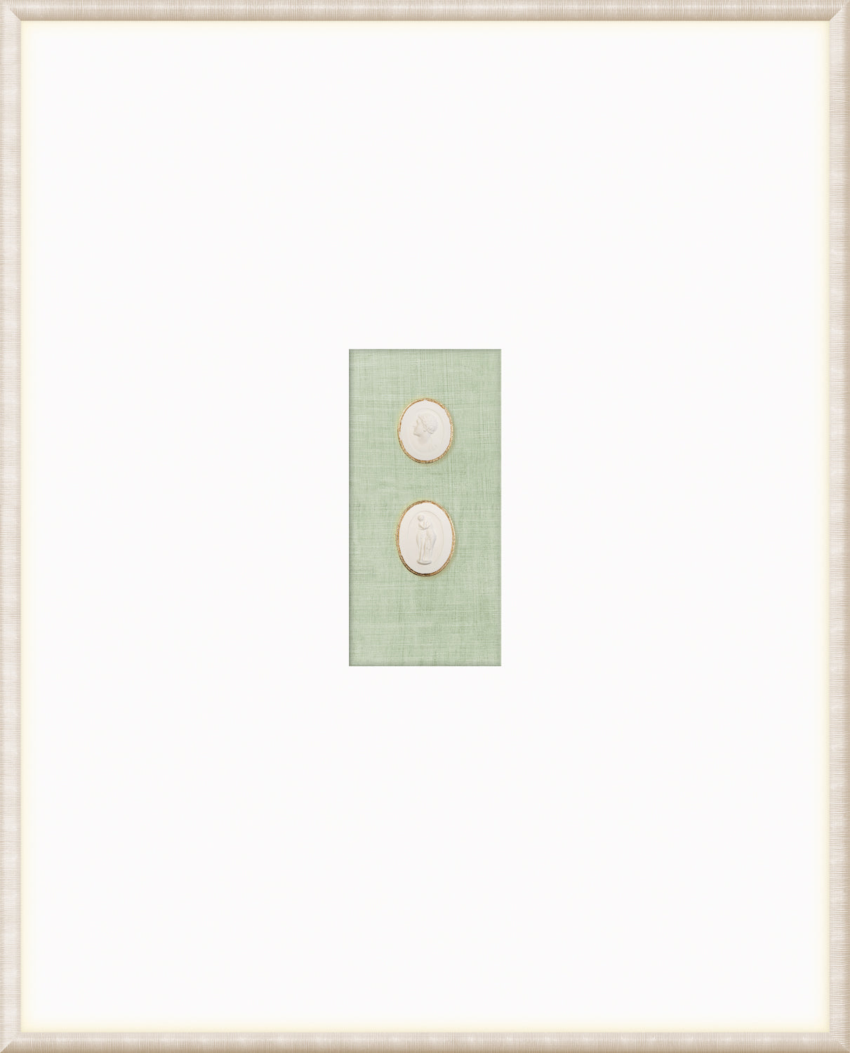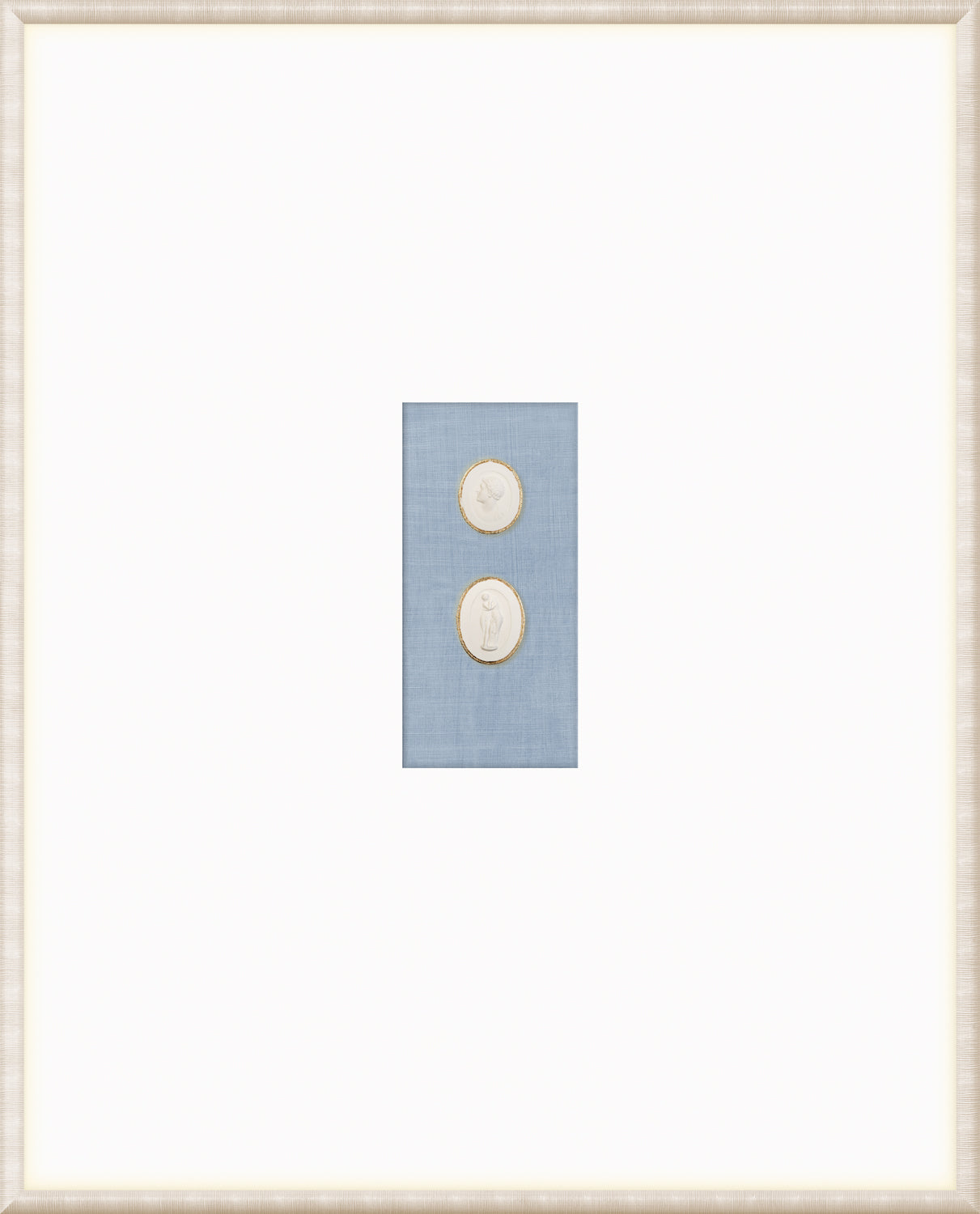 Our collection of Intaglios features both mythological and historical figures. Each one is hand-cast and gilded with fine gold filigree along the upper edge, framing the carved images and making them truly unique pieces. Each grouping is mounted on a linen texture background in a variety of colour options. They are framed in a light, neutral-toned moulding with a striated texture and a wide, raised matte with gilded framespace, giving them even more elegance and luxury. With our wide variety of arrangements and different combinations of Intaglios, you’re sure to find the perfect groupings for you.