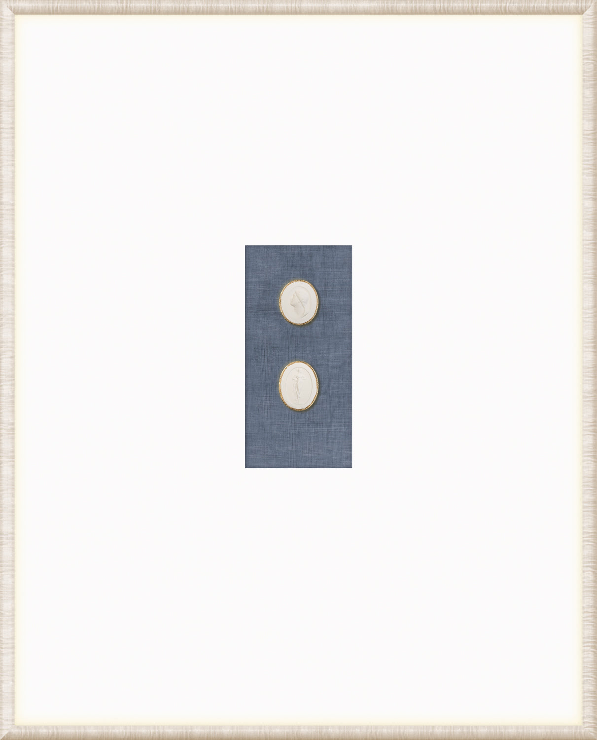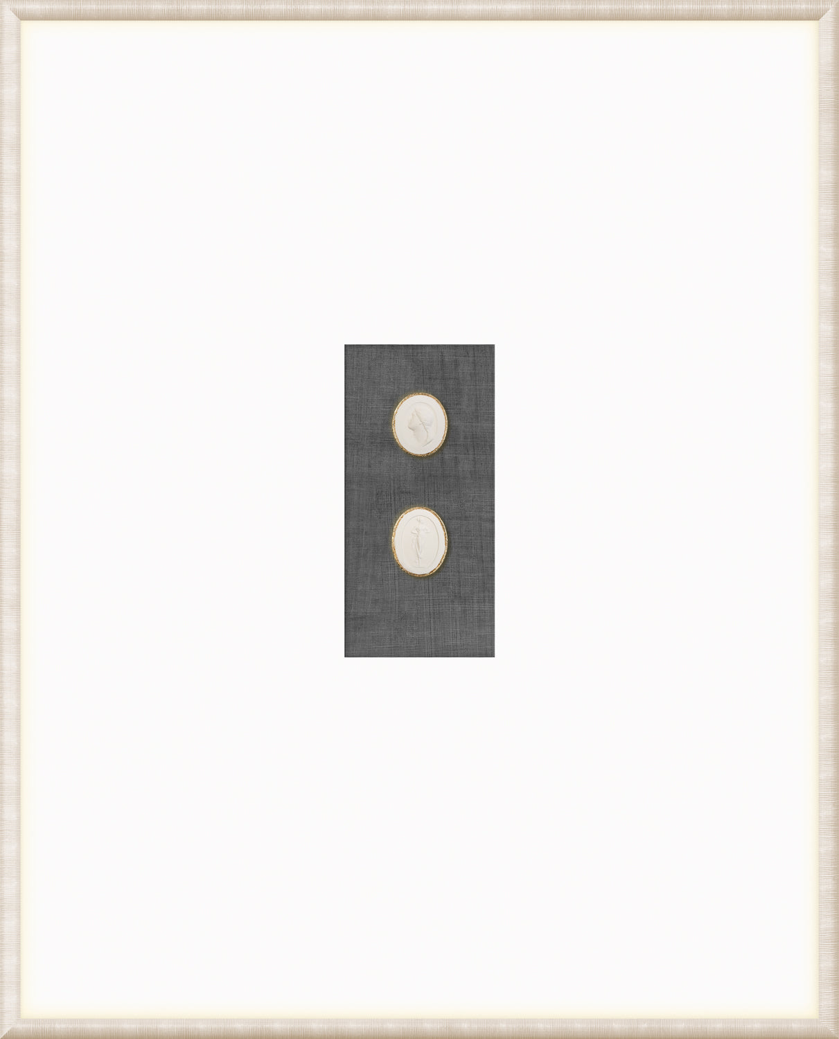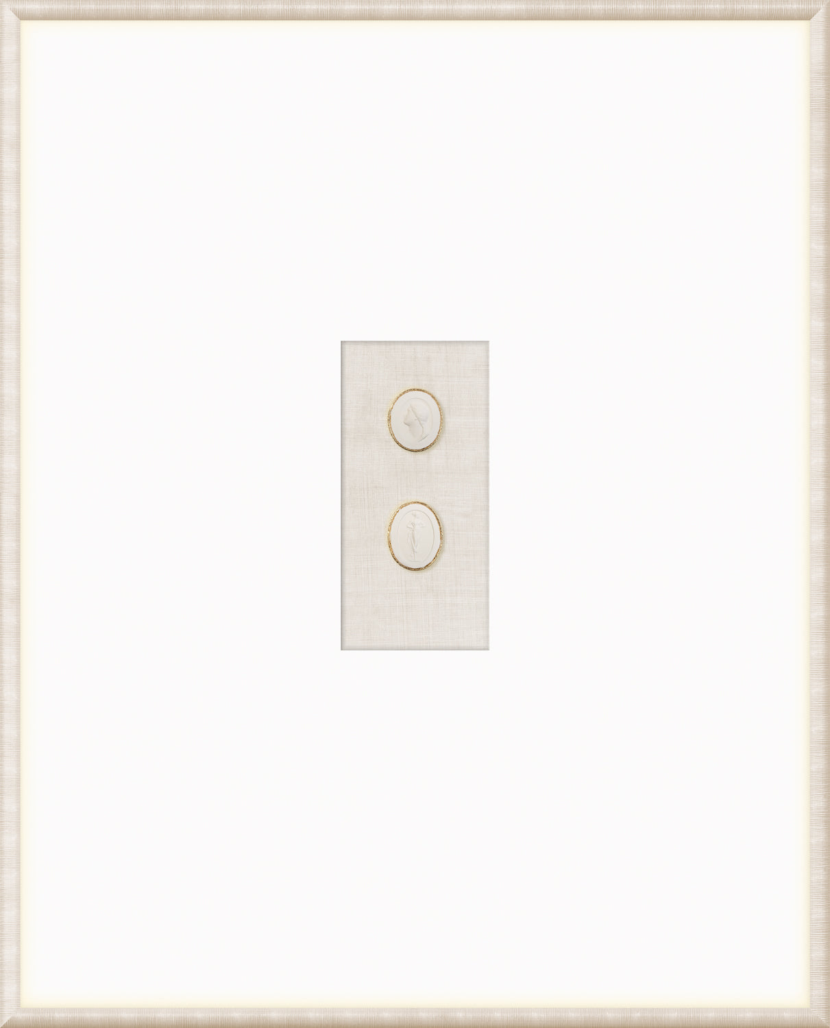 Our collection of Intaglios features both mythological and historical figures. Each one is hand-cast and gilded with fine gold filigree along the upper edge, framing the carved images and making them truly unique pieces. Each grouping is mounted on a linen texture background in a variety of colour options. They are framed in a light, neutral-toned moulding with a striated texture and a wide, raised matte with gilded framespace, giving them even more elegance and luxury. With our wide variety of arrangements and different combinations of Intaglios, you’re sure to find the perfect groupings for you.