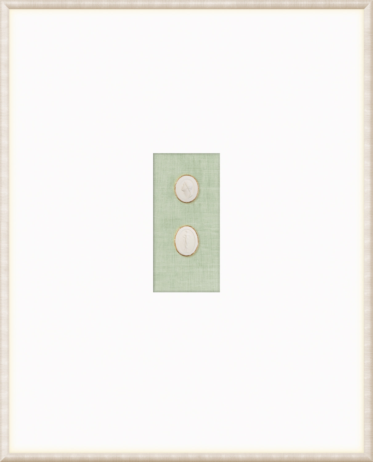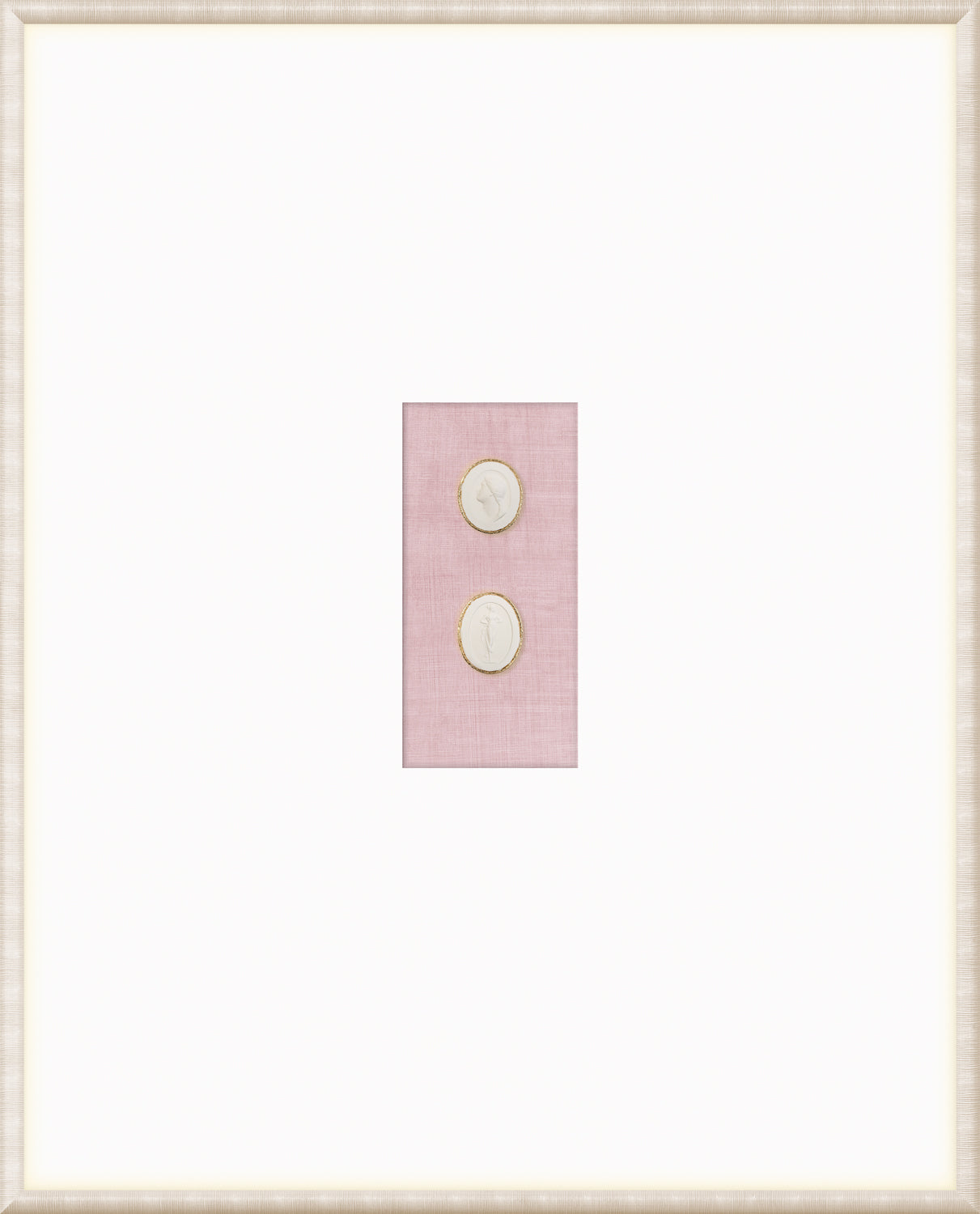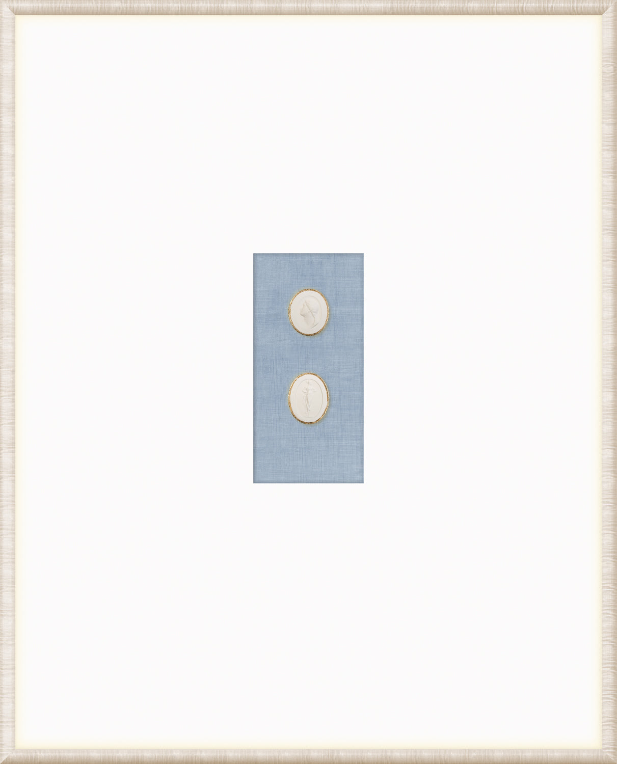 Our collection of Intaglios features both mythological and historical figures. Each one is hand-cast and gilded with fine gold filigree along the upper edge, framing the carved images and making them truly unique pieces. Each grouping is mounted on a linen texture background in a variety of colour options. They are framed in a light, neutral-toned moulding with a striated texture and a wide, raised matte with gilded framespace, giving them even more elegance and luxury. With our wide variety of arrangements and different combinations of Intaglios, you’re sure to find the perfect groupings for you.